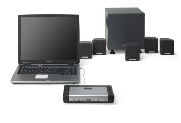 la technologie CMMS (Creative Multi Speakers Surround) permet de simuler un son 5.1 à partir d’une source stéréo classique.Le Multimedia Center apporte également aux portables quatre nouveaux ports USB 2.0, ce qui est toujours appréciable de nos jours, ainsi qu’un connecteur Ethernet 10/100Base-T. Signalons enfin que Toshiba a développé un véritable système