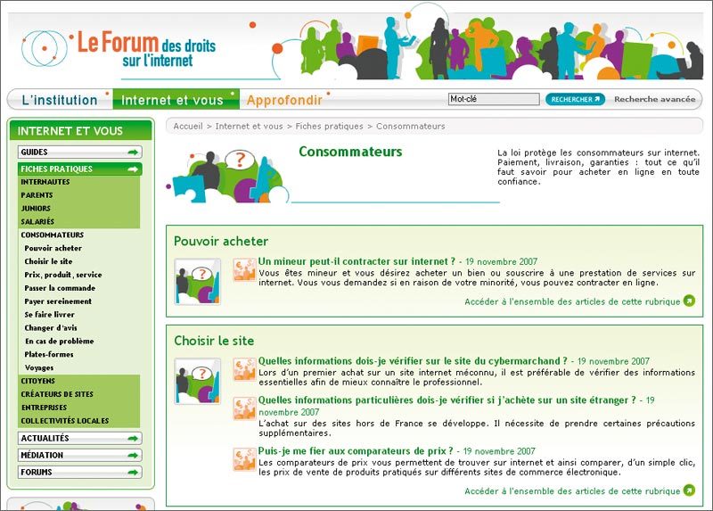 Site de référence sur la nétiquette, le Forum des droits sur l’Internet s”est étoffé vers la fin de l’année dernière. Le guide illustré de seize pages intitulé ‘ Achats en ligne, suivez le guide ‘,