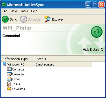 Avec Windows XP, Microsoft fait toujours confiance au logiciel Active Sync, auquel nous reprochons un fonctionnement quelque peu capricieux. Avec Windows Vista et 7, cette fonction, bien rodée également, a pris le nom de Centre de Synchronisation.