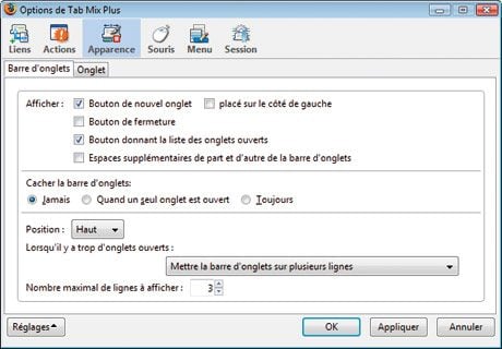 Une multitude de réglages des onglets, tellement pratiques pour la navigation, sont rassemblés dans Tab Mix Plus. Affichage sur plusieurs lignes, choix des raccourcis de clavier et de souris, modification de leur aspect selon