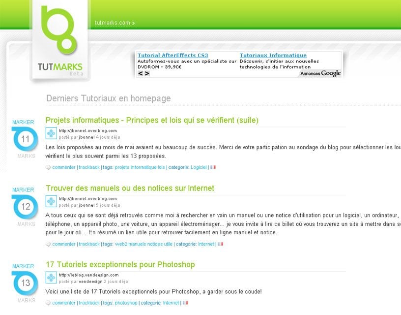 www.tutmarks.comC’est le point de rendez-vous des internautes animant un site ou ayant la fibre technophile. On y trouve en effet toutes sortes de tutoriaux sur le montage vidéo, la programmation, le graphisme ou les suites bureautiques. Que les