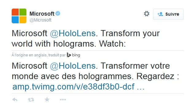 Twitter précise cependant qu’il s’agit là d’une traduction automatique forcément moins aboutie que celle pourrait réaliser un professionnel. D’ailleurs, le réseau social annonce « offrir une traduction automatique des Tweets entre plus de 40 paires de langues. » C’est à se demander si lui-même n’a pas utilisé Bing Translator pour sa page d’explications en français …