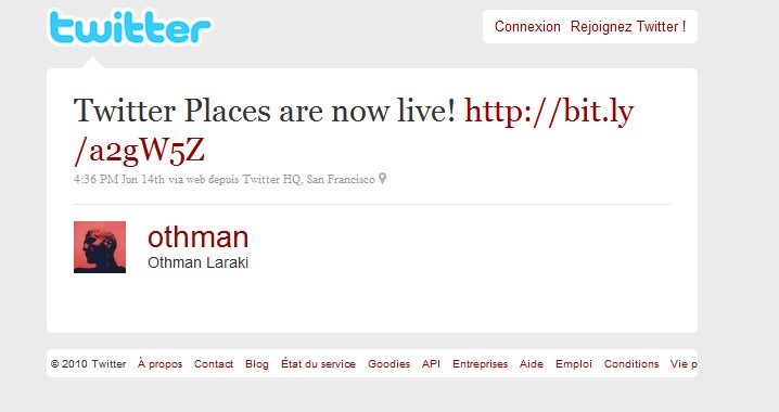 A l’heure ou nous écrivons, Places n’est pas encore disponible en France, mais il est déjà possible de consulter des tweets qui l’ont utilisée, comme celui-ci (voir image ci-contre). A noter que Twitter, loin de vouloir se fâcher avec des services de géolocalisation qui profitent de sa plate-forme, tels Foursquare et Gowalla, a rendu Places compatible avec eux. Autrement dit, si vous effectuez un check-in avec Foursquare, votre tweet sera localisé à l’endroit fourni par Foursquare.