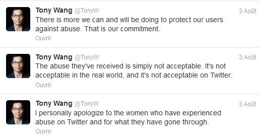 Le directeur général de Twitter en Grande-Bretagne, Tony Wang, a également réitéré ses excuses aux femmes victimes de messages insultants : « Je présente personnellement mes excuses aux femmes qui ont été insultées sur Twitter et pour ce qu’elles ont enduré. Les insultes dont elles ont été victimes ne sont pas acceptables. »