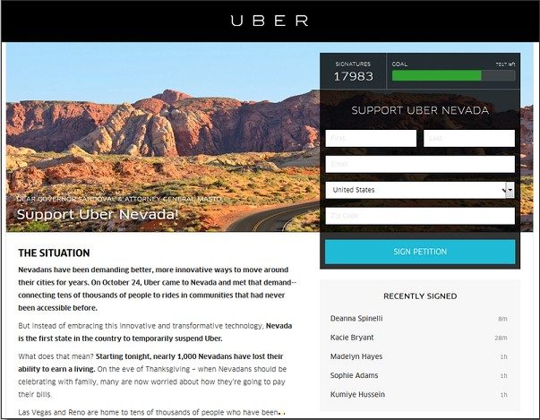 Dans un communiqué, Uber a fait part de sa déception devant cette décision et a signalé que cela entraînerait la destruction de près de 1000 emplois. Néanmoins, l’entreprise indique avoir reçu le soutien de nombreux habitants et se déclare « résolue à travailler avec les dirigeants du Nevada pour faire évoluer ce cadre réglementaire ». La start-up a également lancé une pétition de soutien de son activité dans cet Etat, qui a, à ce jour, récoltée 17 989 signatures.