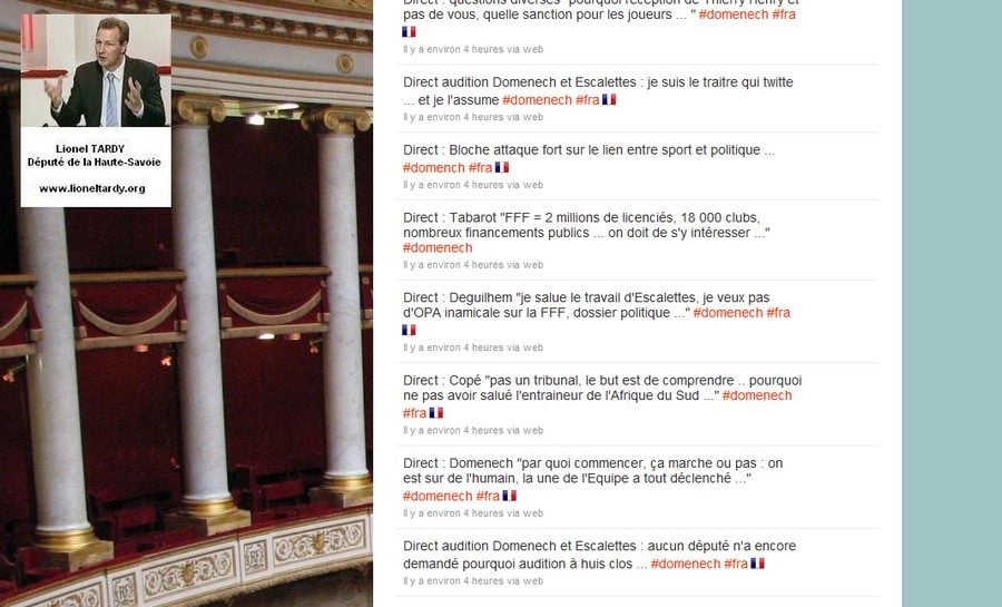 Sur son fil @deputetardy, l’élu avait choisi ce matin de briser le huis clos, en bloguant en direct les réponses de Jean-Pierre Escalettes et Raymond Domenech. « Je suis le traître qui tweete … et je l’assume », écrit-il avec humour, en allusion au « traître » de l’équipe de France (1). Sur son fil, on lit notamment cette remarque du président de la FFF : « Dans le bus j’ai été confronté à un mur jamais vu au cours de mes 50 ans dans le foot ». Quant à Raymond Domenech, on ne trouve qu’une intervention le concernant : « Par quoi commencer, ça marche ou pas : on est sur de l’humain, la une de L’Equipe a tout déclenché… »