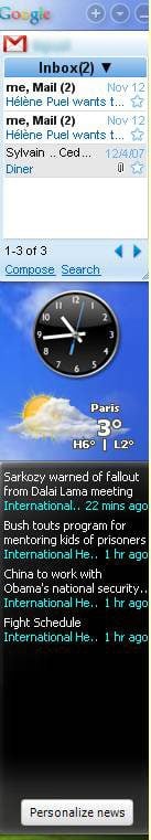 utiliser seul ou inséré dans la ‘ sidebar ‘ de Google Desktop.Dans tous les cas, il faut avoir préalablement installé cette dernière application pour utiliser ce client Gmail. Google Desktop combine le logiciel de recherche sur disques durs de Google et la barre latérale qui permet d’installer des