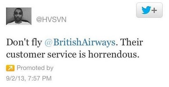 Pas toujours facile de se faire entendre par un service client. Lundi 2 septembre 2013, un internaute a acheté un tweet sponsorisé pour faire part de son exaspération devant l’absence de réaction du service client de British Airways.