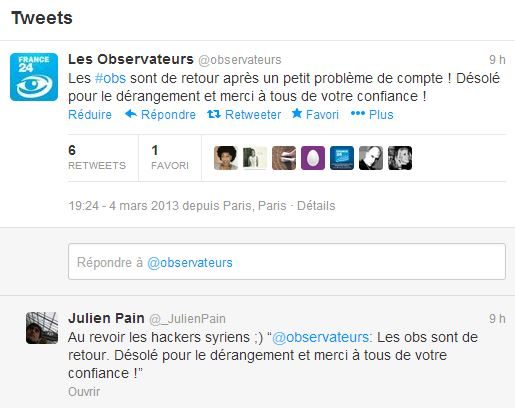 Le site internet Les Observateurs, site de journalisme participatif de la chaîne France 24, a été victime lundi soir 4 mars 2013, d’une attaque informatique provenant d’une entité liée au pouvoir syrien, ainsi que son compte Twitter, a indiqué Julien Pain, responsable éditorial du site.