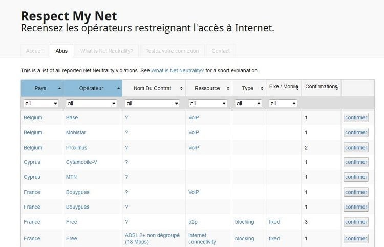 Concrètement, la collecte des témoignages se fait par le biais d’un formulaire et ne requiert que quelques minutes. L’internaute indique son pays d’origine, son opérateur télécoms et le forfait auquel il est abonné. Il doit aussi préciser le type de services concernés par ces restrictions (VoIP, P2P, partage de fichiers…). D’autres internautes dans la même situation peuvent appuyer ces dires par le biais du bouton Confirmer.