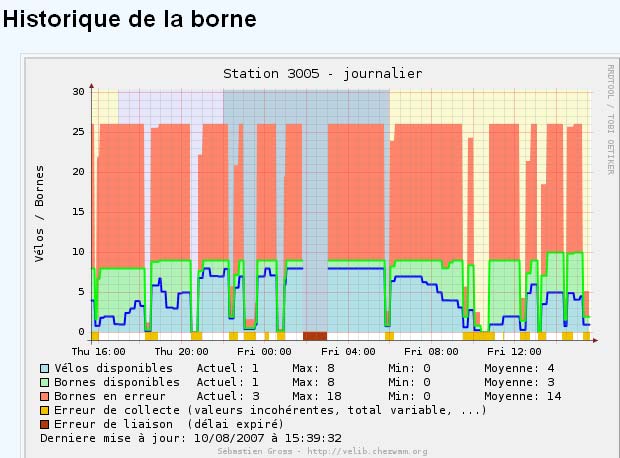 L’un d’entre eux va plus loin puisqu’il stocke depuis fin juillet les statistiques détaillées de chacune des 715 stations. Grâce à lui, il est possible de vérifier que Vélib est un vrai succès, mais également que le taux de bornes indisponibles frôle plutôt les 15 % en permanence au lieu des 5 % annoncés par la Mairie de Paris quelques jours après son lancement. Sur certaines stations, des bornes (jusqu’à la moitié d’entre elles) sont bloquées de façon permanente.