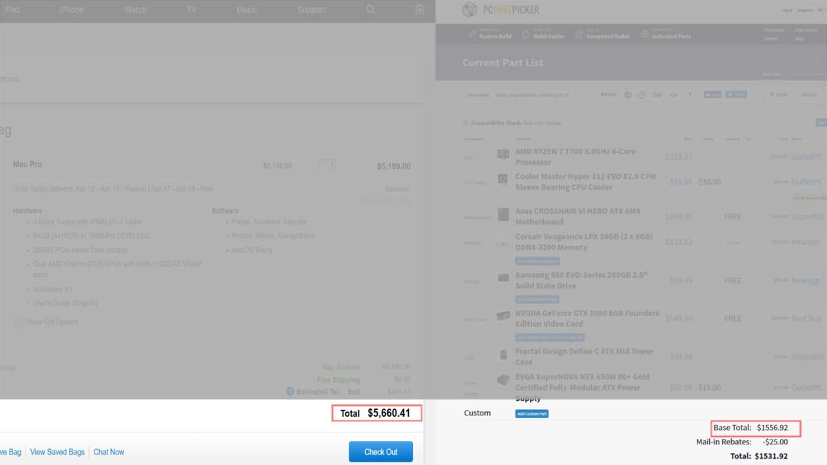 Si vous cherchiez une preuve que l’offre informatique d’Apple est trop chère pour les usages pro requérant du calcul intensif, regardez donc cette vidéo de Tech Guy. Repéré par Petapixel, le YouTubeur à l’accent est-européen a comparé le Mac Pro haut de gamme à 5660 $ d’Apple face à un PC « custom » fonctionnant avec la nouvelle gamme de processeurs AMD Ryzen (ici un Ryzen 7 1700) coûtant seulement 1556 $. Ces deux machines, dont les processeurs respectifs sont cadencés à 3,0 GHz, se sont affrontées sur un filtre de flou radial sous Photoshop CC, une opération qui fait fortement appel au processeur central (lire plus loin).