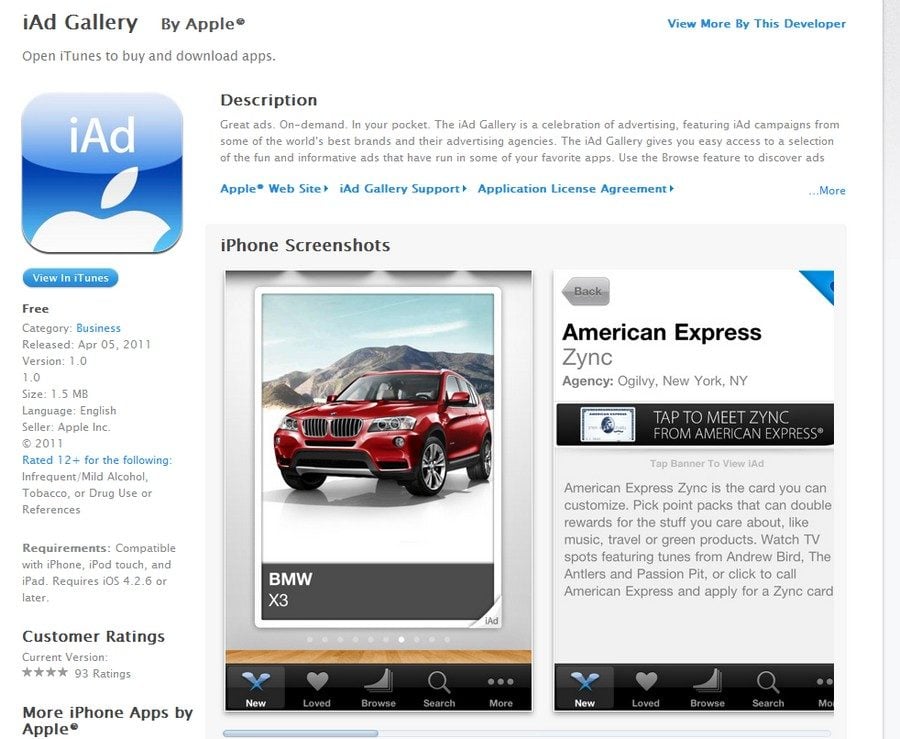 L’application gratuite, intitulée iAd Gallery, permet tout simplement à l’utilisateur d’apprécier les campagnes de publicité iAd (le réseau publicitaire d’Apple au sein des applications gratuites), réalisées par les marques les plus connues et par leurs agences. « L’iAd Gallery vous donne un accès facile à une sélection de publicités amusantes et informatives [sic] qui ont été diffusées dans vos applications préférées », décrit l’entreprise à la pomme. Qui invite à utiliser la fonction « Browse » pour découvrir les publicités, ou les redécouvrir (sait-on jamais). Il est même possible de « taguer » les réclames préférées…