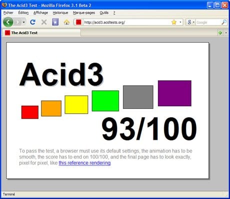 CSS 2.1 et CSS 3 et des balises HTML 5.Le score de la bêta 2 au test Acid 3 atteint 93/100, contre 89/100 pour la bêta 1. La version actuelle de Firefox