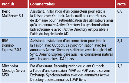 Exchange : l’authentification, que ce soit chez Mirapoint, IBM ou Kerio, peut être prise en charge par l’annuaire Active Directory de Microsoft. Le stockage de paramètres annexes, tels différents numéros de téléphone ou de fax,