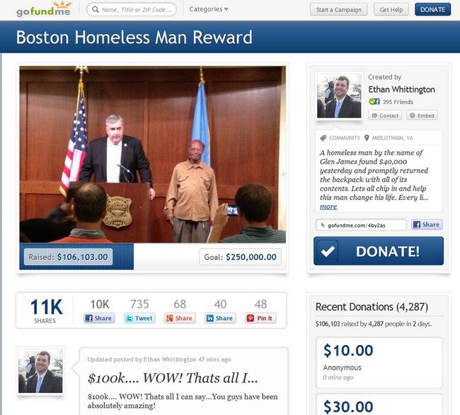 En apprenant ce faits divers le lendemain, un jeune comptable de 27 ans, Ethan Whittington décide de lancer une collecte sur le site de crowfunding GoFundme pour aider « cet homme, symbole d’espoir et d’humanité, à changer de vie ». Et les dons affluent. Si la moyenne des sommes versées tourne autour de 20 dollars, certains internautes ont sorti 250 dollars de leur poche. Et parmi les donateurs, certains proposent des vêtements, un ordinateur voire un logement.