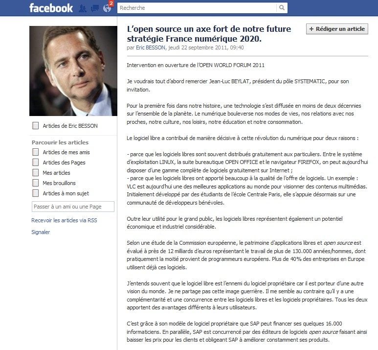 « J’entends souvent que le logiciel libre est l’ennemi du logiciel propriétaire car il est porteur d’une autre vision du monde. Je ne partage pas cette image guerrière. Il me semble au contraire qu’il y a une complémentarité et une concurrence entre les logiciels libres et les logiciels propriétaires. Tous les deux apportent des avantages différents à leurs utilisateurs », a notamment dit Eric Besson.