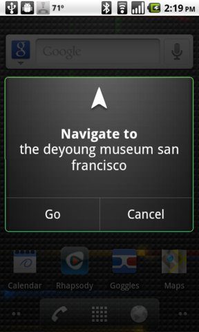 En tout, une douzaine de commandes sont disponibles dans Voice Actions, un logiciel malheureusement réservé aux possesseurs de mobiles sous Froyo (Android 2.2). Autre souci : ces fonctions ne sont pour le moment disponibles qu’en anglais. Le téléchargement de cette nouvelle version du module n’est cependant pas inutile aux francophones, puisqu’elle ajoute quelques fonctions pratiques à la recherche vocale, dont une suggestion de réponses quand le système n’est pas certain de ce que vous avez prononcé.