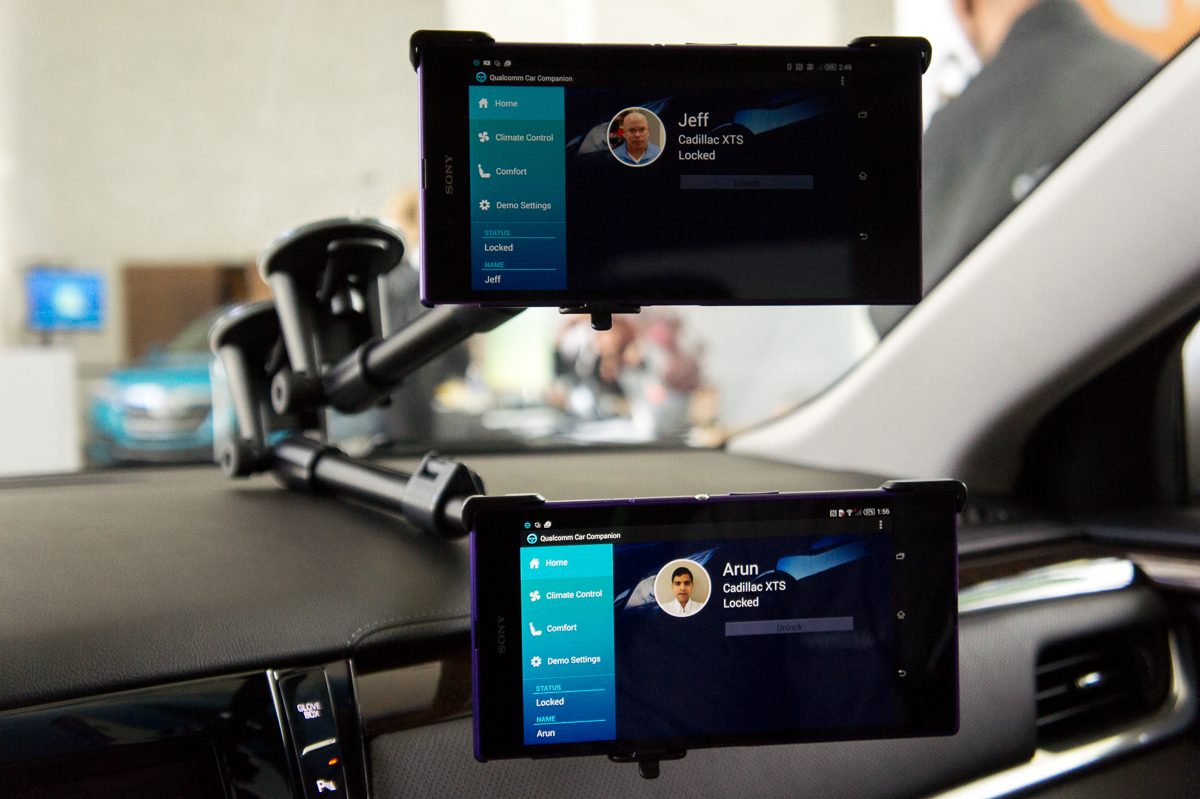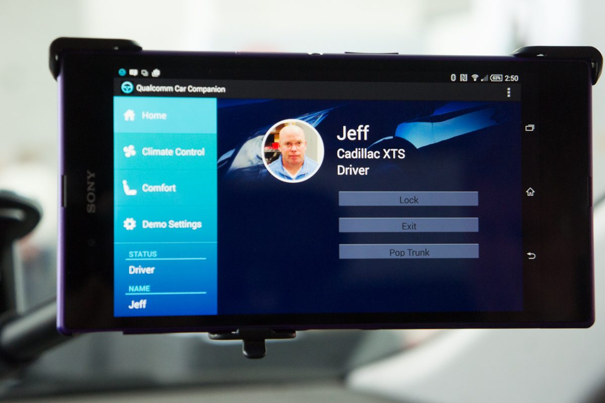 Ici, notre conducteur, « Jeff », peut mémoriser la position de son siège électrique qui sera ensuite automatiquement réglé lorsqu’il se connectera à la voiture. L’application « Qualcomm Car Companion » permet également de piloter la climatisation, verrouiller les portes ou encore ouvrir le coffre via l’écran tactile du smartphone.