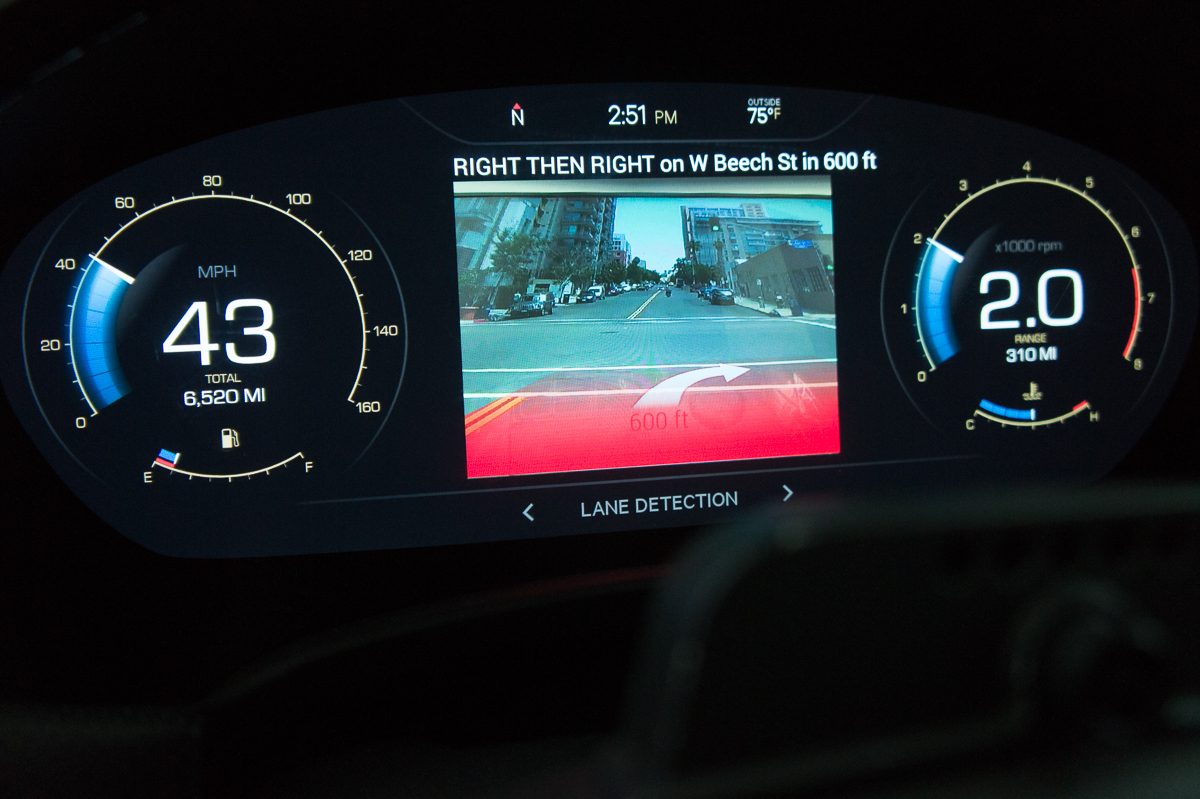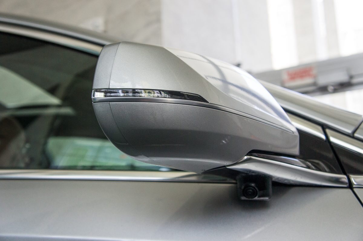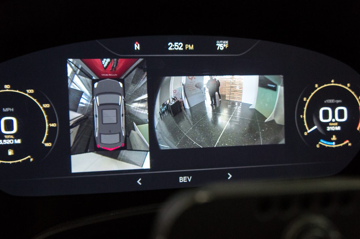 À l’extérieur, le véhicule est équipé de quatre caméras : une dans la calandre, une autre au niveau du coffre et une sous chaque rétroviseur. Rien d’extraordinaire, on trouve déjà ce type d’installation chez plusieurs constructeurs pour assister les conducteurs dans les stationnements compliqués, grâce à une vue à 360 degrés qu’on retrouve ici sur l’écran LCD qui remplace l’instrumentation à aiguilles conventionnel.