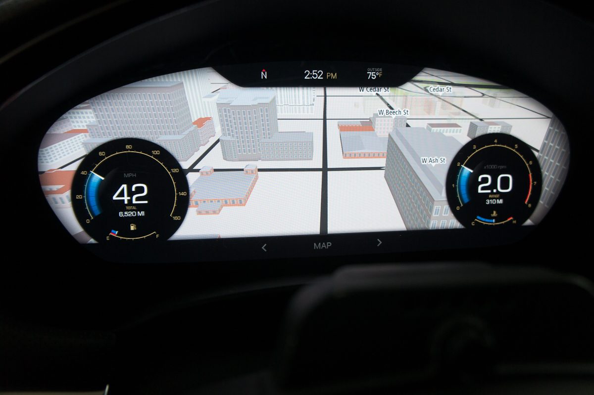 Dernier élément de confort et de sécurité, le volant de la Cadillac intègre un bouton de reconnaissance vocale. Là encore un dispositif qui permettra de dicter une adresse au GPS ou appeler un contact. Ici la commande vocale peut également servir à fermer ou ouvrir les fenêtres de la voiture. À cet état de simple démonstration technologique, ce sont toutes les vitres qui s’ouvrent ou se ferment complètement, mais on peut tout à fait imaginer d’autres commandes pour piloter indépendamment chaque fenêtre.