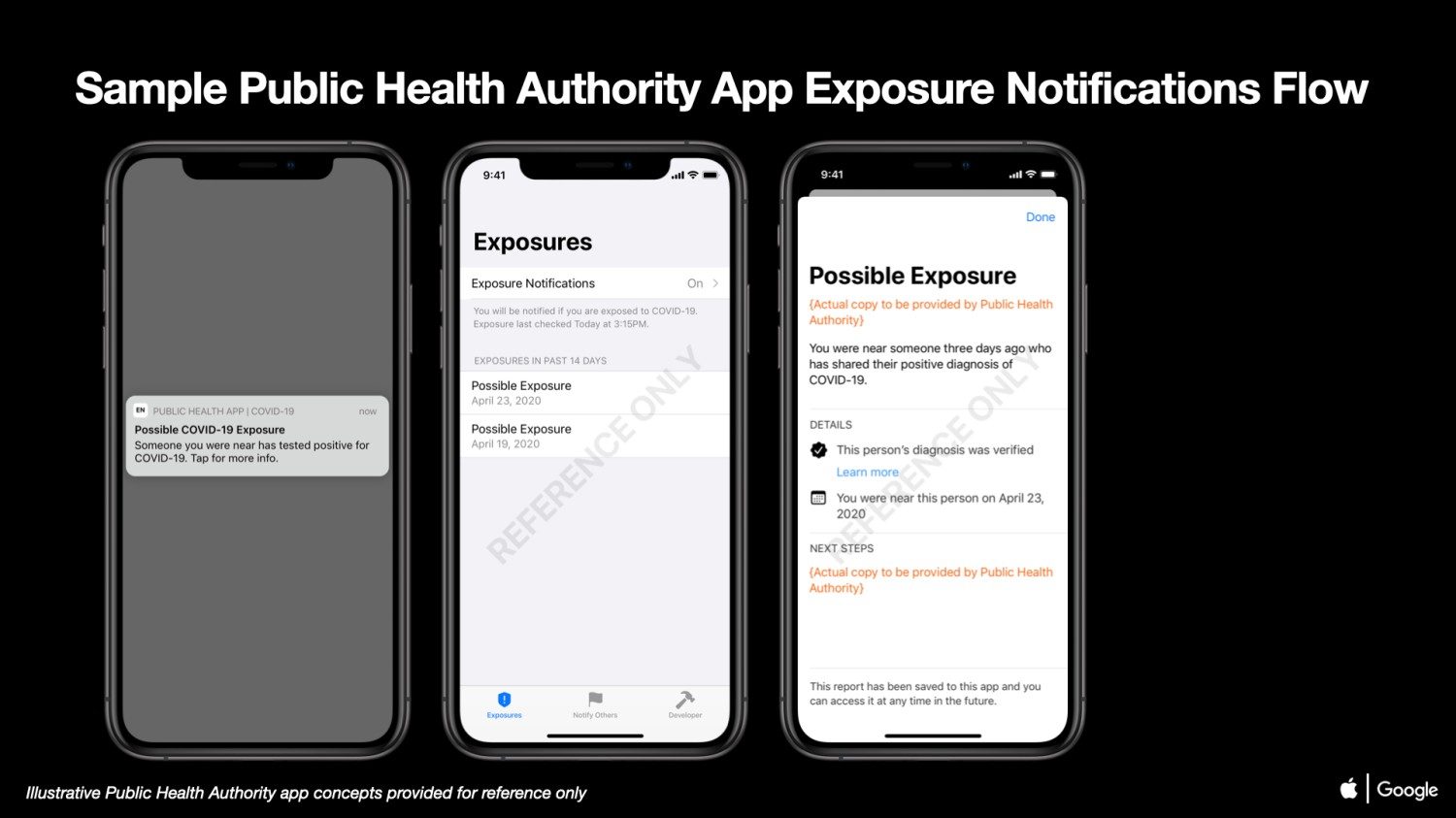 Apple et Google ont donné davantage de précisions sur leur technologie de « contact tracing ». Selon TechCrunch, les deux entreprises ont publié auprès des développeurs des exemples d’interfaces graphiques qui montrent le fonctionnement d’une telle application. En particulier, on voit à quoi peuvent ressembler une alerte de contamination potentielle et la notification d’un test positif auprès de l’agence de santé.