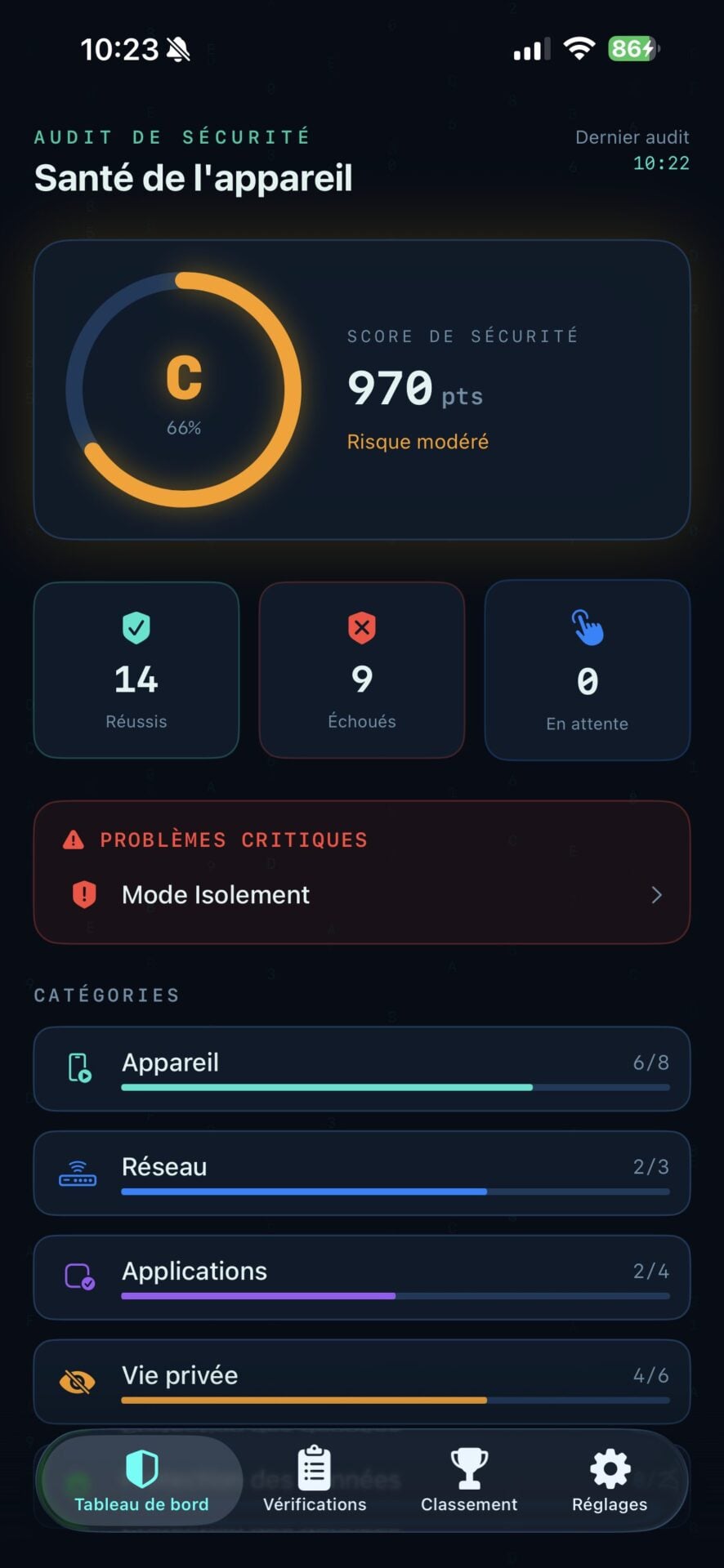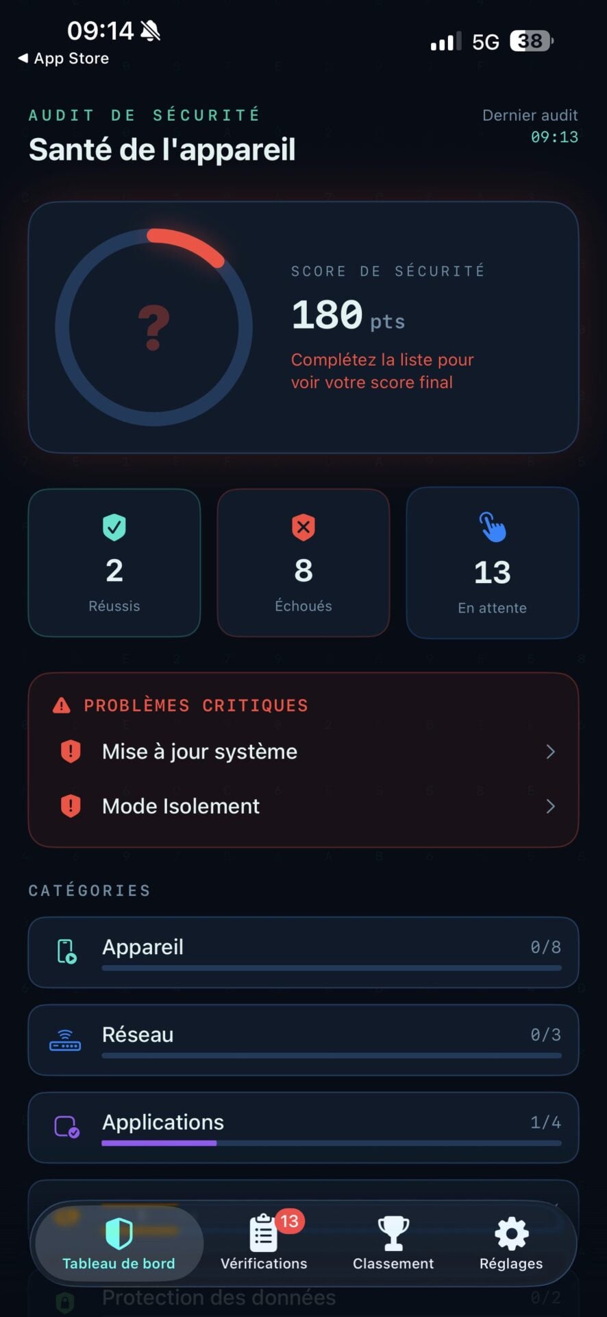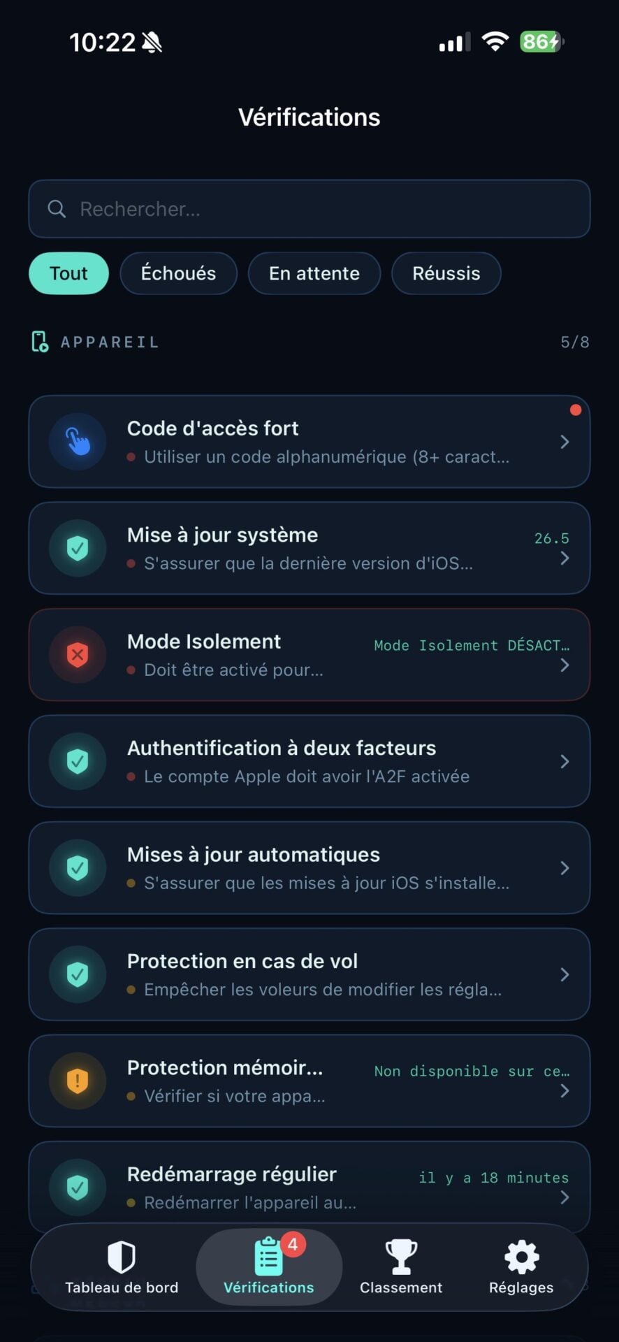Pour savoir si votre iPhone est parfaitement sécurisé, Verifium procède à 23 vérifications de sécurité réparties en cinq catégories : durcissement de l’appareil (bonnes pratiques pour renforcer la sécurité de l’iPhone), exposition réseau, applications installées, paramètres de confidentialité et protection des données.