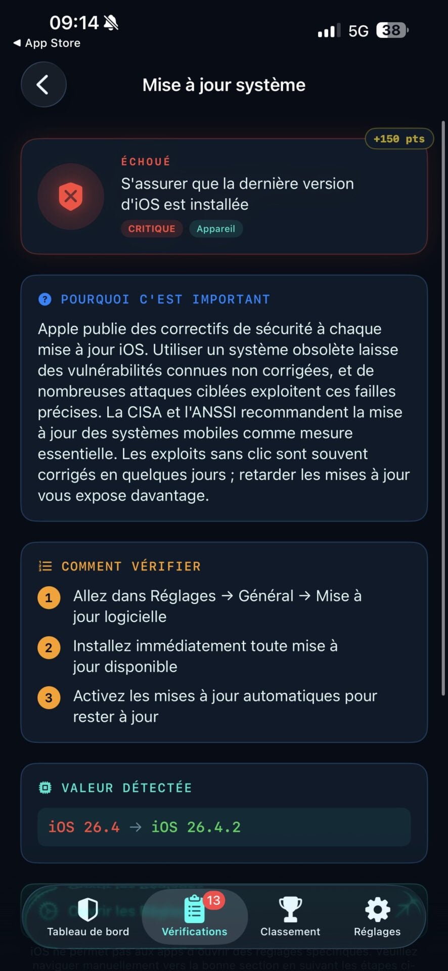 Verifium, c’est son nom, est une application gratuite et open source (code disponible sur Github) proposant aux possesseurs d’iPhone de renforcer la sécurité de leur appareil en suivant un certain nombre de bonnes pratiques recommandées par l’ANSSI (Agence Nationale de la Sécurité des Systèmes d’Information), de la CISA (Certified Information Systems Auditor, l’ANSSI américaine) et des propres recommandations d’Apple.