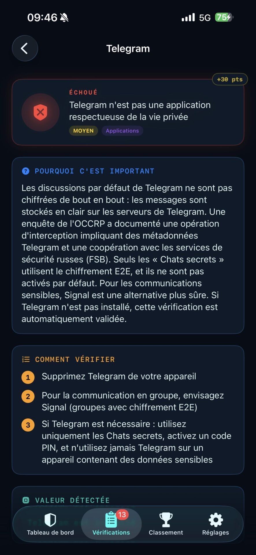 En se basant sur l’API d’iOS, Verifium va d’abord procéder à 11 vérifications automatiques de base. L’appli va ainsi vérifier si vous disposez de la dernière version à jour d’iOS, si le mode isolement est configuré, la fréquence de redémarrage de l’appareil, la présence d’une configuration VPN ou d’applications spécifiques pouvant présenter un risque pour la sécurité de l’appareil. Comme WhatsApp, Signal ou encore Telegram.