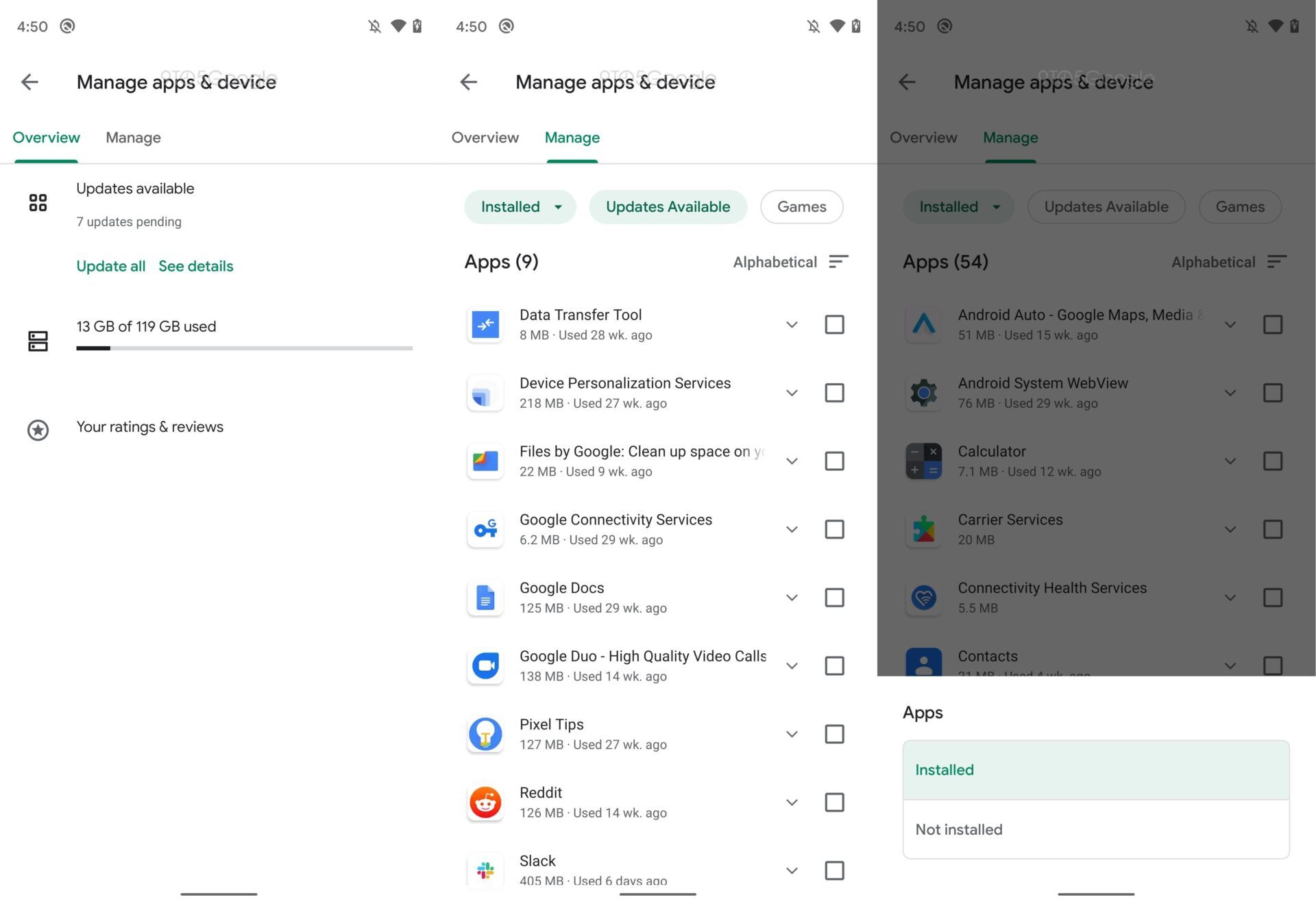 Tout d’abord, la section Mes jeux et applications devrait prochainement profiter d’un ravalement de façade. Pour l’heure, quatre onglets sont proposés : les mises à jour (qui est sans doute le plus utilisé), les Applications installées, la Bibliothèque ainsi que les applications en Bêta. 9to5Google a réussi à activer une nouvelle interface sur laquelle Google travaillerait déjà depuis plusieurs semaines. Plus simple, et surtout plus claire, elle s’architecture autour de deux onglets Aperçu (Overview) où sont affichés les mises à jour disponibles et l’espace de stockage restant, et Gérer les applications et les appareils (Manage apps & device) qui permet de gérer les applications installées sur l’appareil.