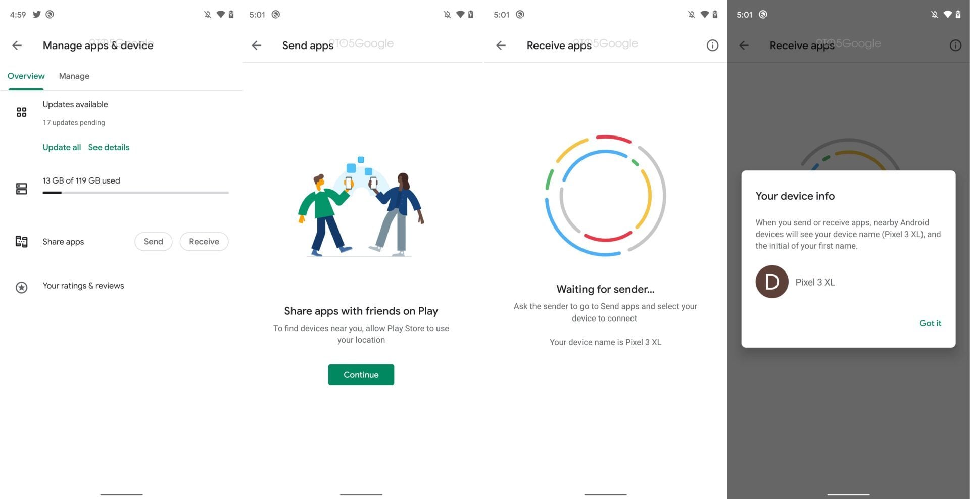 Mais la nouveauté la plus intéressante est sans nul doute une fonction d’installation avec d’autres appareils. Elle permettra ainsi d’installer une application déjà présente sur un terminal Android sur d’autres appareils Android, sans qu’il ne soit nécessaire que ceux-ci soient connectés à Internet. Cette fonction de partage fonctionnerait grâce à un système de connexion en Peer-to-peer, comme cela existe déjà pour le partage de fichiers notamment au sein du gestionnaire de fichiers Files de Google.