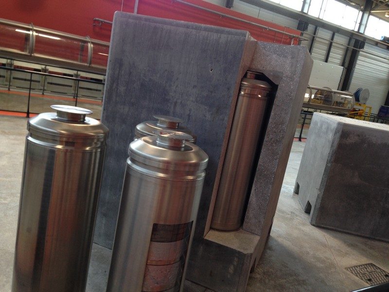 Nous pénétrons à pied dans une succession de larges galeries bien éclairées. Le site final, lui, sera équipé de voies ferrées, afin que les déchets coulés dans du béton soient acheminés sans que des hommes n’aient à intervenir.