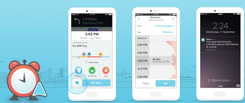 En se basant sur des analyses historiques du trafic mais également sur d’autres événements comme une période de départs en vacances, Waze affiche les moments de la journée où le voyage se fera dans les meilleures conditions. L’utilisateur n’a qu’à indiquer à quelle heure il souhaite arriver à destination. Pour éviter d’être en retard, il reçoit une alerte quelques minutes avant le départ, comme peut le faire Google Now.