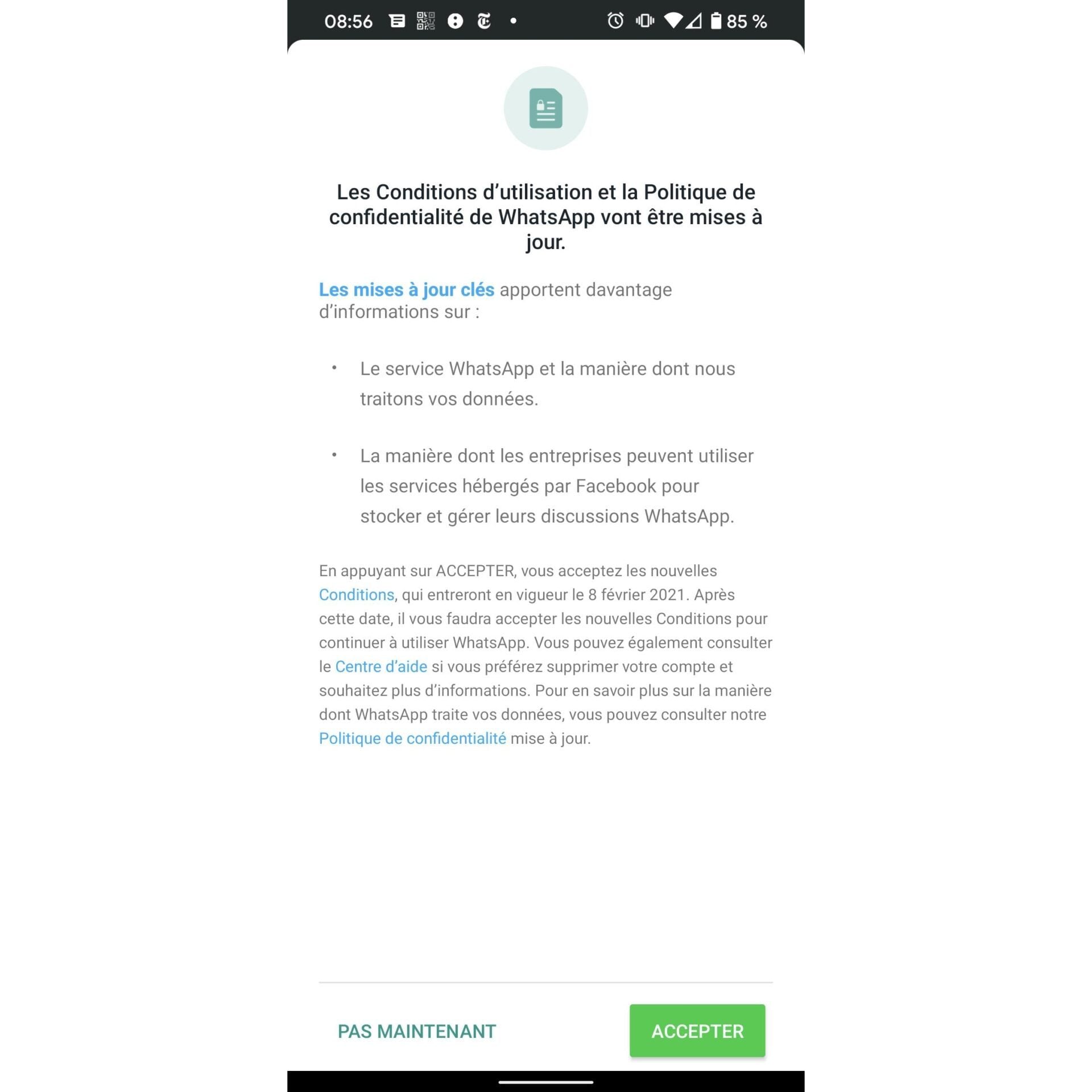 A l’heure où nous écrivons ces lignes, WhatsApp semble tout juste commencer à envoyer cette notification sur les appareils de ses utilisateurs français. Avec ses nouvelles conditions d’utilisation, WhatsApp prend ses utilisateurs à la gorge : aucune option pour refuser n’est cette fois proposée, et les utilisateurs qui n’accepteront pas ces nouvelles règles d’ici le 8 février prochain ne pourront tout simplement plus utiliser l’application.