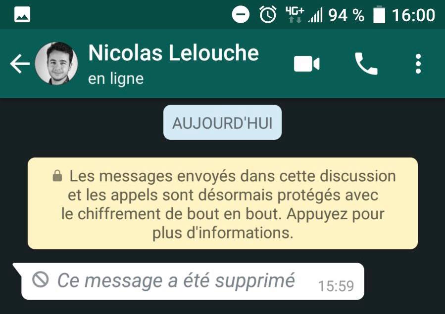 À noter qu’une fois un message supprimé, votre correspondant le voit remplacé par une mention « Ce message a été supprimé ». Impossible de simplement faire disparaître une erreur et de s’en sortir sans laisser de trace…