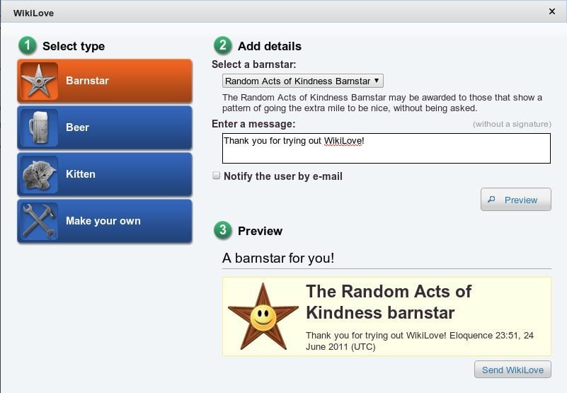 Encourager les éditeurs de Wikipédia et des autres projets de Wikimedia à continuer de produire des contenus. Voilà l’objectif du bouton WikiLove, actuellement en phase de test, que la fondation compte intégrer à compter du 29 juin à la version anglophone de l’encylopédie collaborative, comme elle l’indique sur son blog.