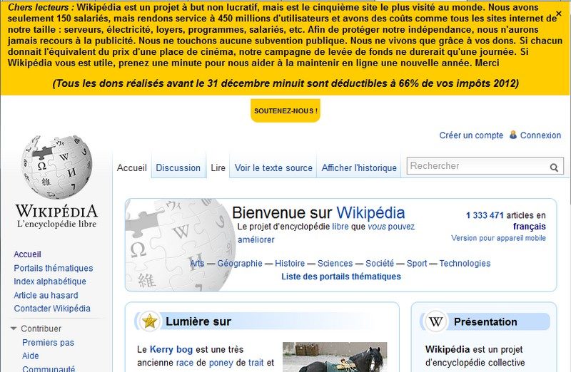 Pour sa neuvième campagne de dons, lancée le 27 novembre dernier, la fondation Wikimedia a annoncé qu’elle a déjà récolté 25 millions de dollars auprès de 1,2 million de donateurs. Elle estime avoir atteint son objectif en « un temps record », a rapporté le site TechCrunch, jeudi 27 décembre 2012.