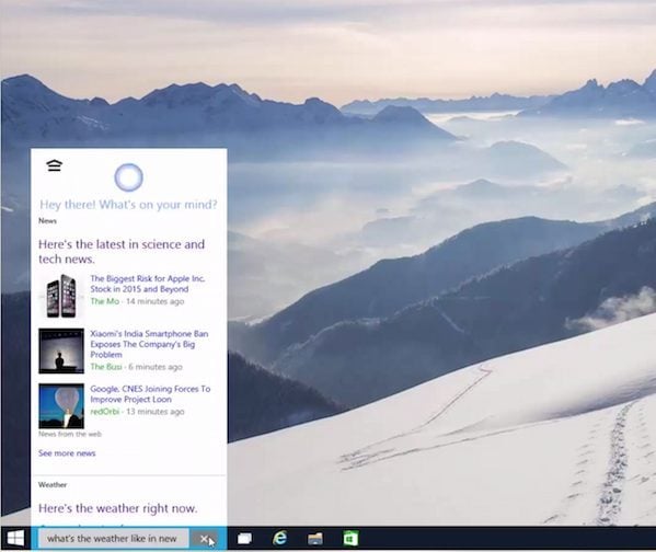 Et une nouvelle fuite pour Windows 10 ! Cette version, notamment récupérée par Winbeta, porte le doux nom de build 9901 et s’avère intéressante à plusieurs titres. D’abord parce qu’elle intègre ce qui pourrait être l’interface définitive de l’assistant vocal Cortana. Qui vient s’intégrer dans la barre des tâches, aux côtés du champ de recherche, par le biais d’une petite icône « micro ». Cortana n’est cependant pas actif dans cette version, mais on remarque déjà qu’il dispose des mêmes fonctions que son pendant Windows Phone. A noter qu’il sera également possible d’appeler l’assistant par un « Hey Cortana » !