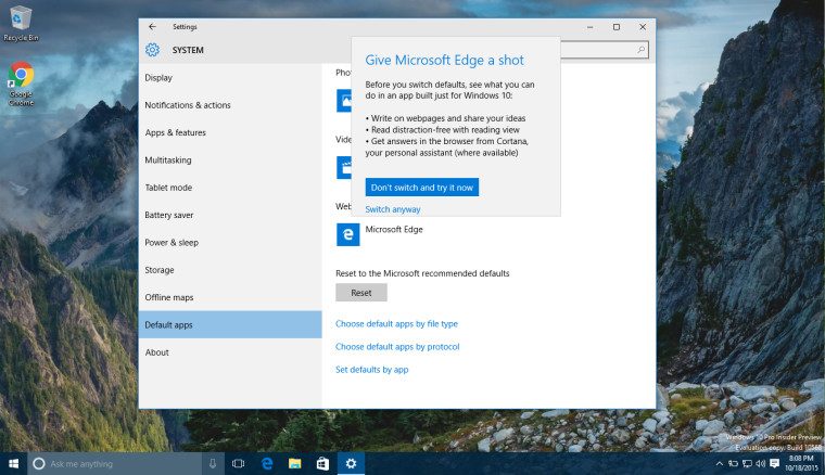 Microsoft veut vraiment que vous utilisiez Edge, le nouveau navigateur de Windows 10. A tel point que si vous installez par défaut un autre butineur, comme Chrome ou Firefox, Windows pourrait demain tenter de vous faire changer d’avis.