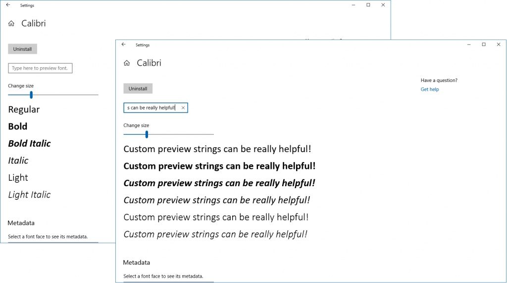 La nouvelle Build de Windows 10 fait également la part belle aux polices de caractères. Elle introduit un nouveau panneau de configuration dédié qui affiche les polices installées, avec un système détaillé de prévisualisation qui permet par exemple de changer la taille.