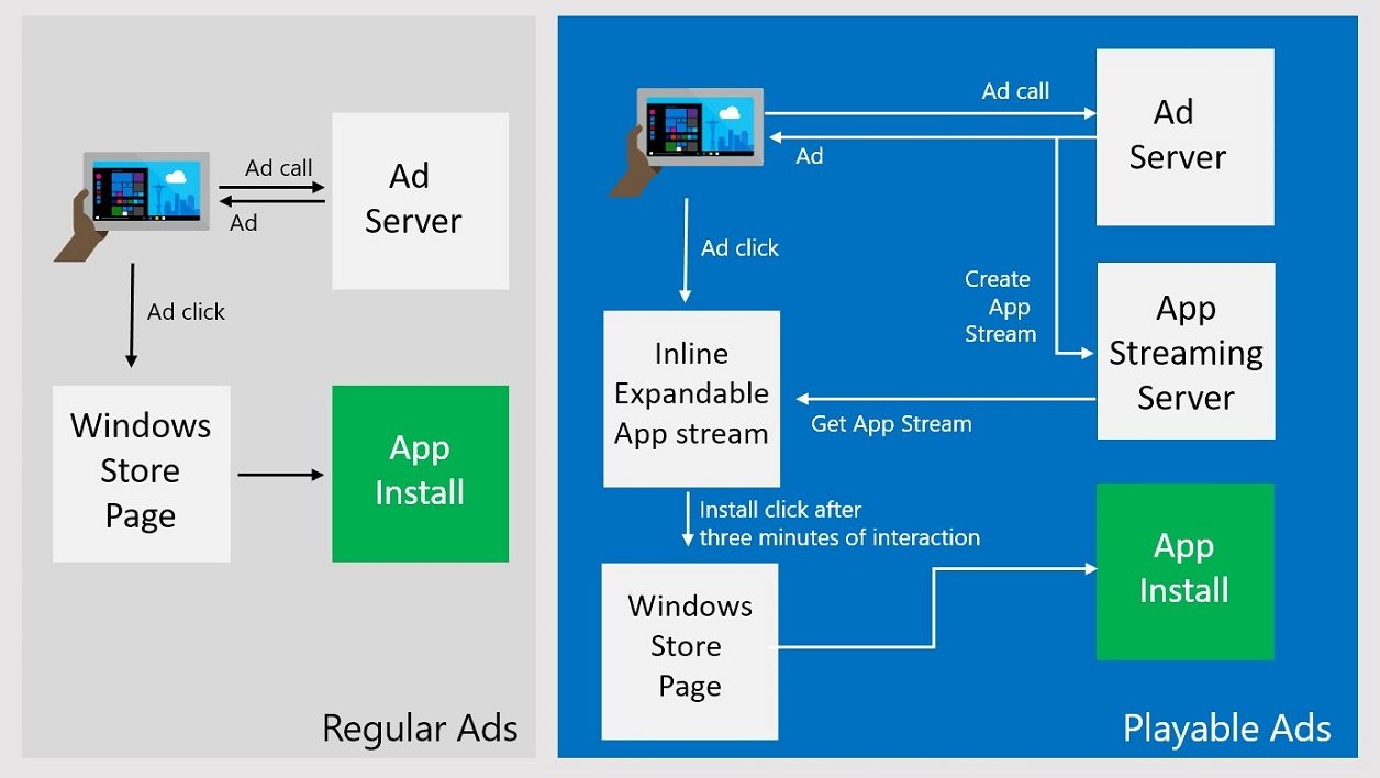 Ce ne sera bientôt plus nécessaire avec la possibilité de tester une application sans avoir besoin de l’installer. Microsoft propose en effet aux développeurs de créer des publicités interactives pour leurs programmes. Grâce à un système de diffusion en streaming, l’utilisateur peut interagir pendant trois minutes avec l’application comme si elle était installée sur son ordinateur. Le graphique ci-dessous montrent les différences de fonctionnement entre les publicités classiques dans Windows 10 (Regular Ads à gauche) et le nouveau mode interactif (Playable Ads à droite).