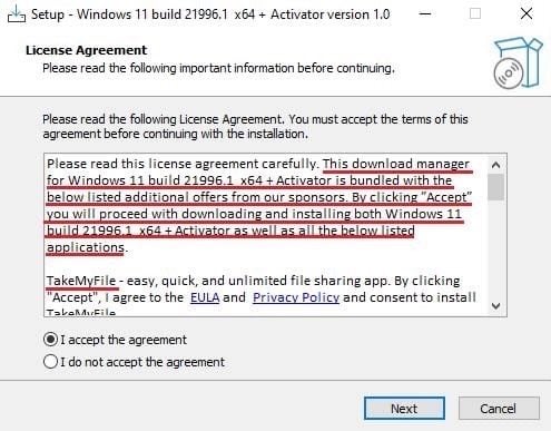 Si la taille de ce programme (1,75 Go) peut laisser penser qu’il contient Windows 11, il n’en est rien. Il va en réalité télécharger et installer un ou plusieurs malwares sur l’ordinateur.