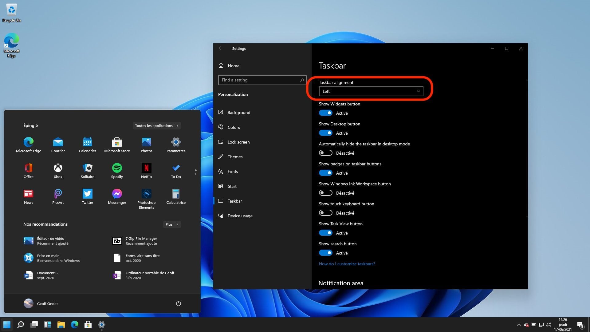 Une option permettant de choisir l’alignement du menu Démarrer et de la barre des tâches a été ajoutée dans les Paramètres de Personnalisation de la Barre des tâches : il sera donc possible de la conserver au centre, ou de la placer à gauche, pour donner à votre Windows 11 un petit côté vintage de Windows 10.