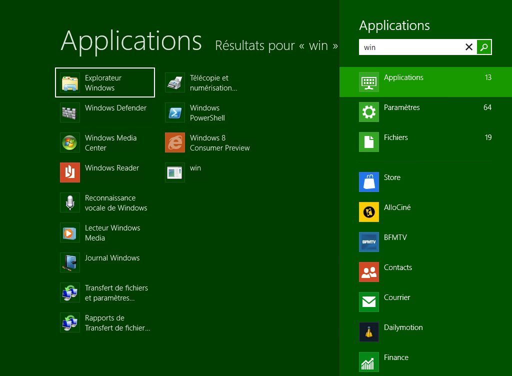 Ce système n’est d’ailleurs pas tout à fait revenu à la « normale ». Dans la Developer Preview, la recherche échouait tant qu’un mot complet n’avait pas été saisi. Dans la Consumer Preview, le filtrage s’est amélioré (il suffit de faire l’essai avec Win par exemple) mais étrangement « REG » n’affiche toujours pas « REGEDIT » parmi les choix possibles.