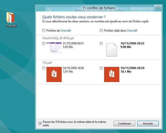 En revanche, le mécanisme se montre beaucoup plus intelligent lorsque des conflits apparaissent ! Désormais, lorsque Windows repère que les fichiers en conflit ont la même taille, la même date (au centième de seconde près) et le même nom, il vous propose d’ignorer simplement l’opération pour ces fichiers.