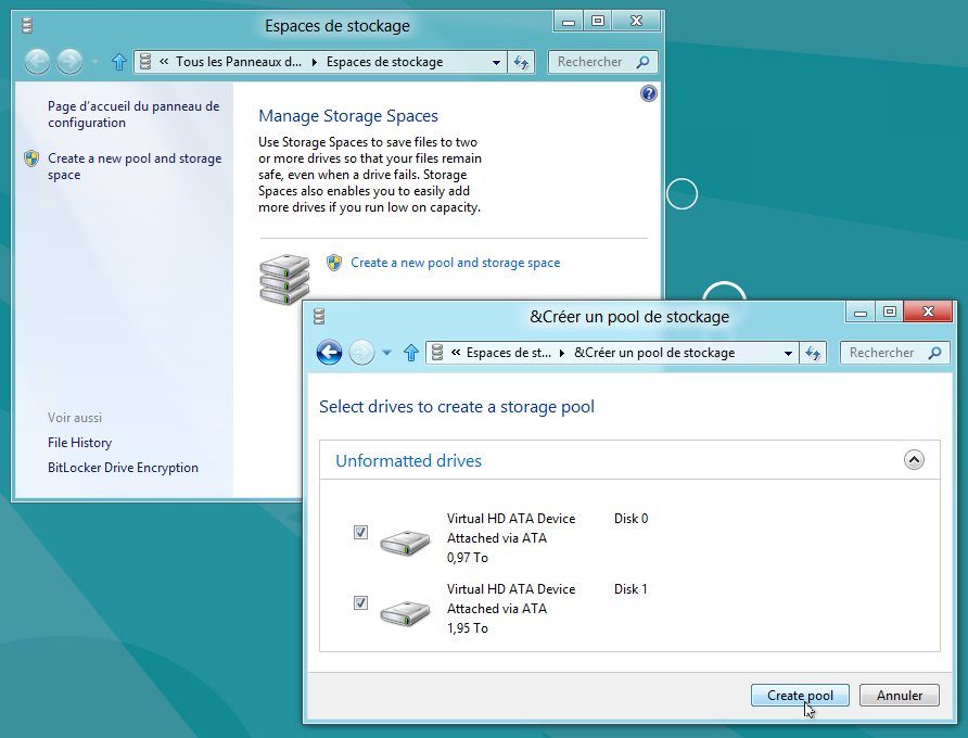 Dans un premier temps, on met en œuvre un Pool. Un Pool agrège les différents disques physiques en un seul et unique disque logique. Si vous avez un disque de 1 To et un de 2 To, vous obtenez grâce au Pool un vrai disque logique de 3 To. Pour toutes les applications et pour l’explorateur, votre PC est équipé d’un disque de 3 To !