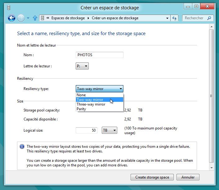 Autre innovation, ces partitions sont intelligentes et incorporent des technologies de protection des données ! Lorsque vous définissez, par exemple, un espace de stockage nommé Photos pour accueillir vos clichés, vous pouvez indiquer que celui-ci contiendra des données précieuses. Dès lors, Windows veillera à toujours conserver un duplicata des données sur un disque physique différent (plusieurs méthodes de résilience sont proposées). Si l’un des disques physiques du Pool venait à rendre l’âme, les données de l’espace ainsi protégé seraient toujours accessibles grâce à leur duplicata masqué.