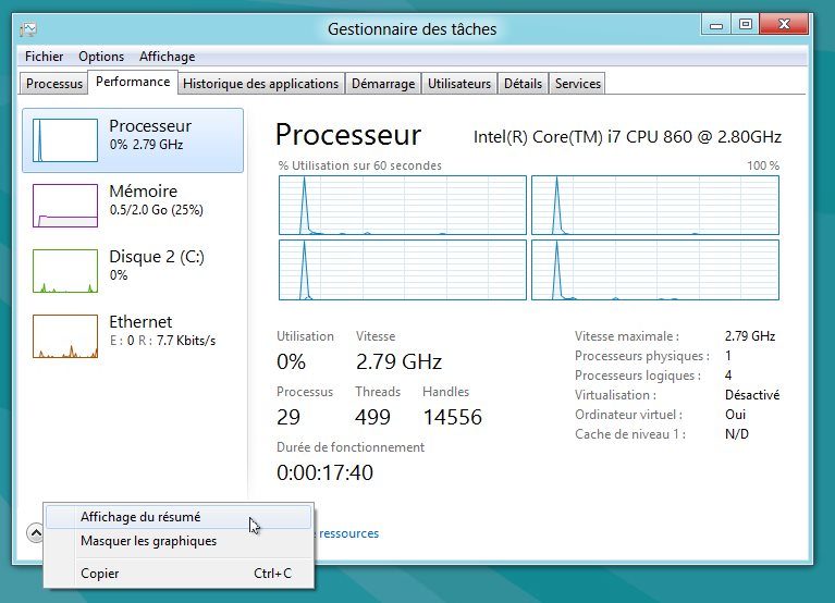 L’onglet Performance est celui qui a le plus évolué depuis la Developer Preview. Les modifications sont essentiellement visuelles et cosmétiques. Mais voilà un véritable tableau de bord de l’état du PC mis à la disposition de tous !
