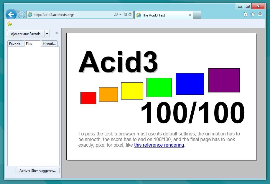 Passée au crible d’Acid 3, cette version préliminaire du navigateur affiche enfin un 100/100 attendu de longue date. Microsoft s’est enfin mis au standard du Web, et son implémentation HTML5/CSS3 est désormais au niveau de la concurrence. Pour l’instant, l’interface utilisateur reste celle de IE9, seuls les moteurs de rendu ont évolué.