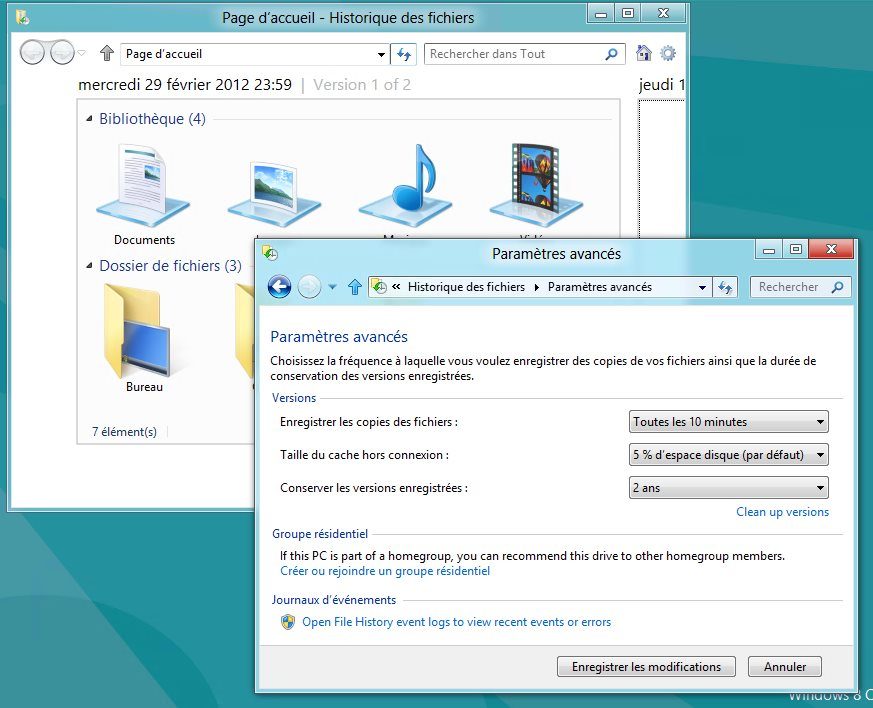 Il s’agit ni plus ni moins d’une évolution de la fonction Versions précédentes de Windows 7. Depuis l’explorateur Windows, lorsque l’on se place dans un disque ou un dossier et que l’on clique sur Historique, on obtient une vue de son contenu à différentes dates. On peut ainsi littéralement remonter le temps et retrouver d’anciennes versions de fichiers effacées ou modifiées par erreur !